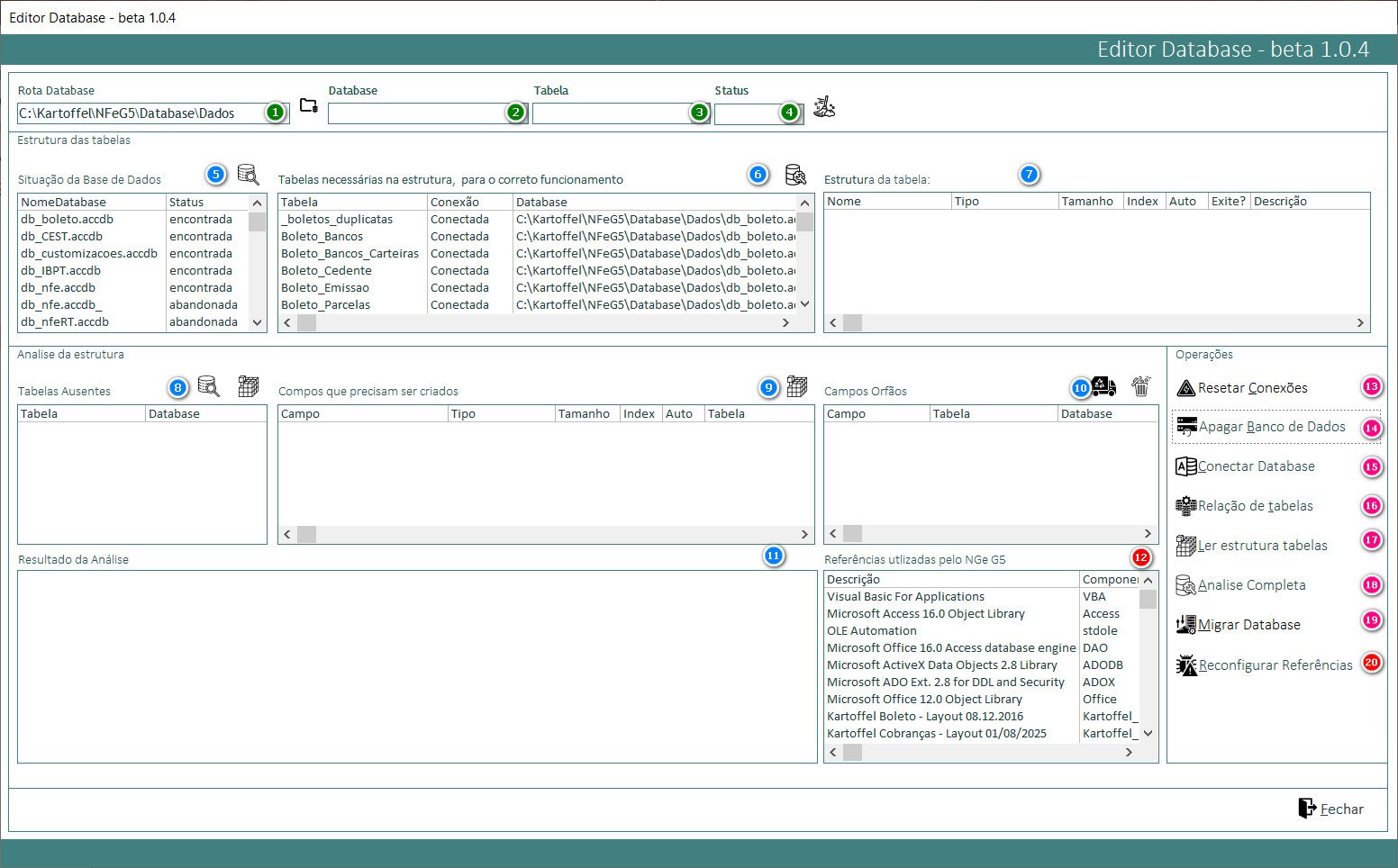- Resetar Conexões: refaz todas as relações do NFe G5 com base na roda da base de dados padrão