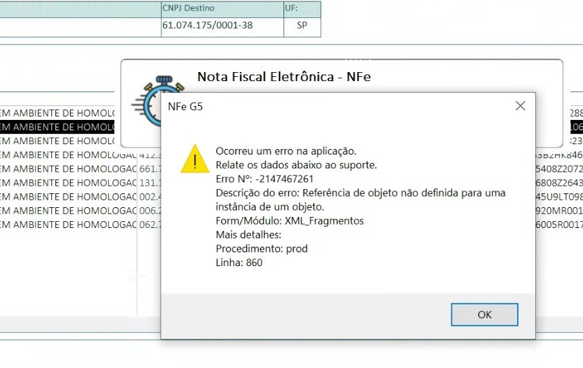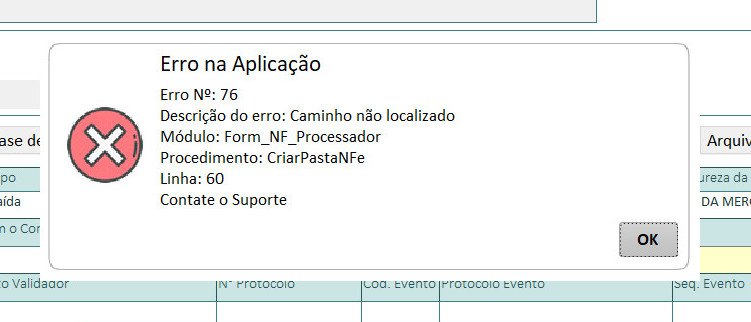 Quando ocorre um erro no NFe G5, o módulo VBA emite um aviso de alerta ao usuário informando o erro em questão.