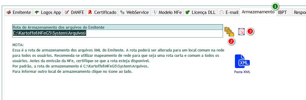 A rota padrão de armazenamento do NFe G5 é "C:\kartoffel\NFeG5\System\Arquivos\", mas poderá ser alterado conforme a necessidade do usuário.