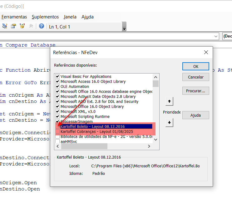 Nota: a rota de instalação do MSAccess.exe varia de versão para versão.