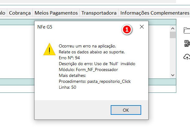 Quando ocorre um erro no NFe G5, o módulo VBA emite um aviso de alerta ao usuário informando o erro em questão.