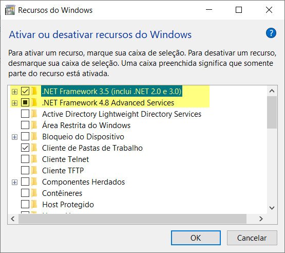 Para ambas as instalações os recursos .NET Framework 3.5 e 4.8 devem estar habilitados nos 'Recursos do Windows'